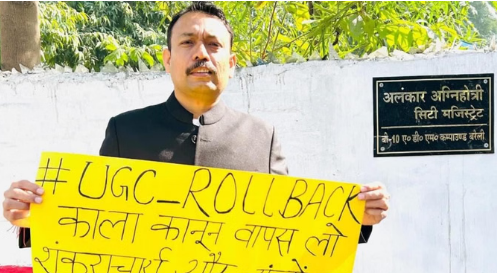अलंकार अग्निहोत्री का कहना है कि वह शंकराचार्य स्वामी अविमुक्तेश्वरानंद के शिष्यों की पिटाई से आहत हैं। साथ ही उन्होंने यूजीसी के नए कानून का विरोध भी किया। इस संबंध में सिटी मजिस्ट्रेट अलंकार अग्निहोत्री की एक तस्वीर सोमवार को सोशल मीडिया पर सामने आई है, जिसमें वह पोस्टर लेकर खड़े दिखाई दे रहे हैं।